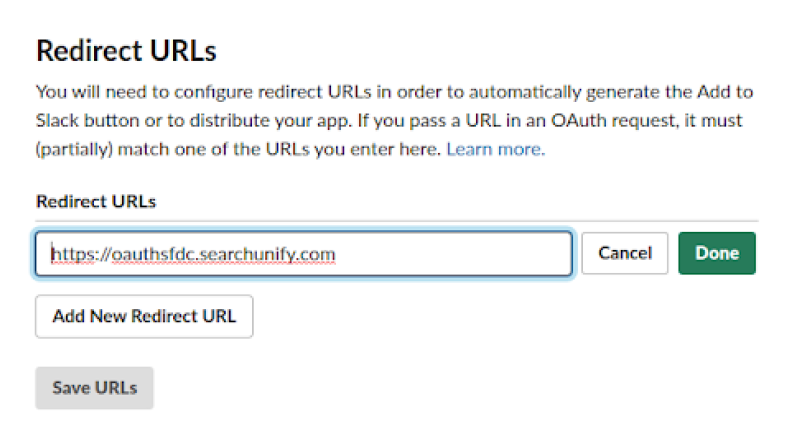 Click Add New Redirect URL and enter https://oauthsfdc.searchunify.com. After that, click Done and Save URLs.