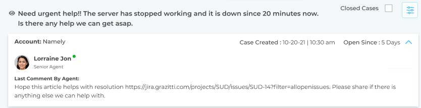 Clicking on a row expands it and new details about a case appear. The details include: (1) Case title, (2) Account name, (3) Case creation date and time, (4) Open date and time; if open, (5) Closed date and time; if closed, (6) Agent assigned, (7) Agent role, (8) Agent profile image, (9) Agent account status, (10) Agent’s last comment, and (11) Preview.
