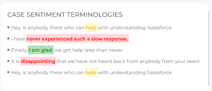 The rationale behind customer sentiment is visible through Case Sentiment Terminologies, another report next to Case Sentiment Score. The new report highlights the words and phrases which carry customer sentiment. For example, "glad" is associated with a Positive sentiment but "disappointed" suggests a negative customer sentiment.