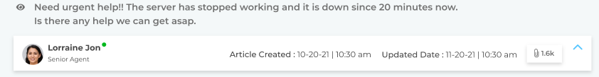 Clicking either the title or the author name expands the row and you can see article and author details, such as (1) Agent profile image, (2) Agent name, (3) Agent role, (4) Agent account status, (5) Article creation date, (6) Last update date, (7) Article attach count, and (8) Preview.