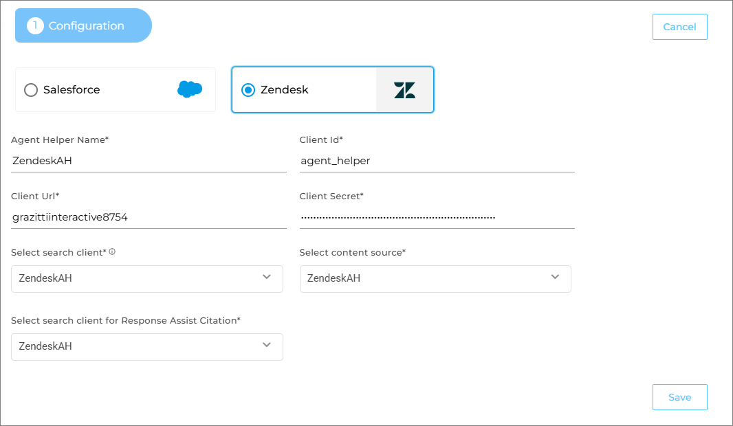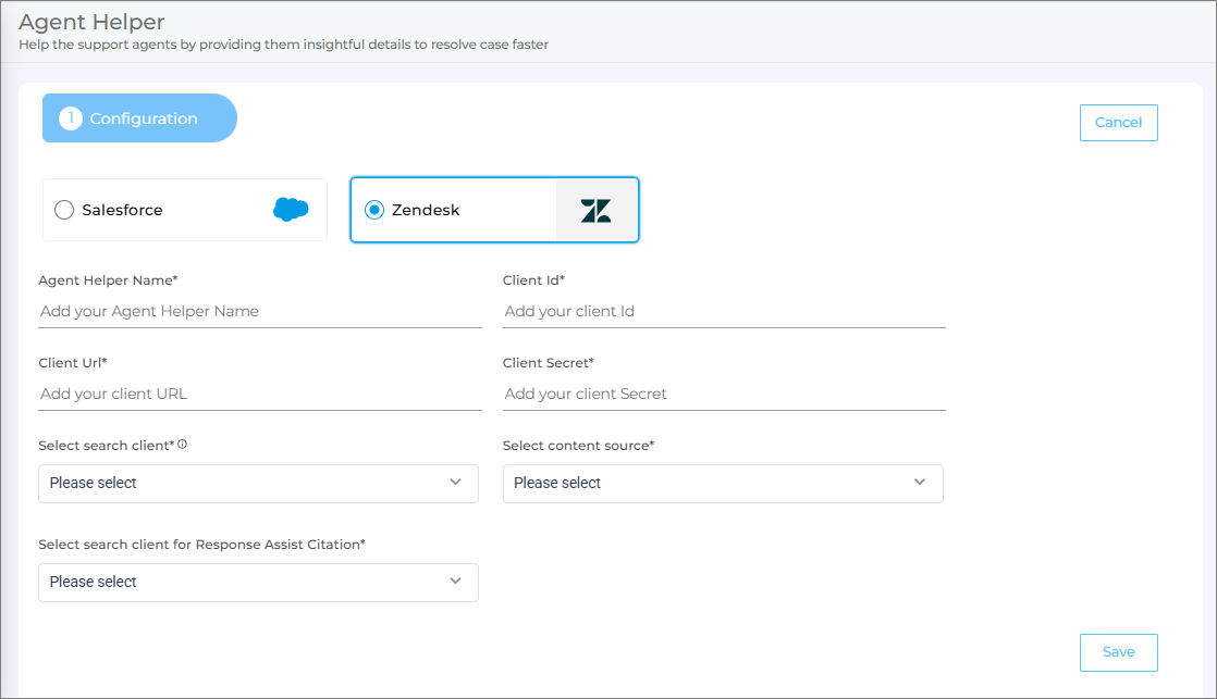 Select search client: Select your Zendesk search client you want to configure with the Agent Helper.