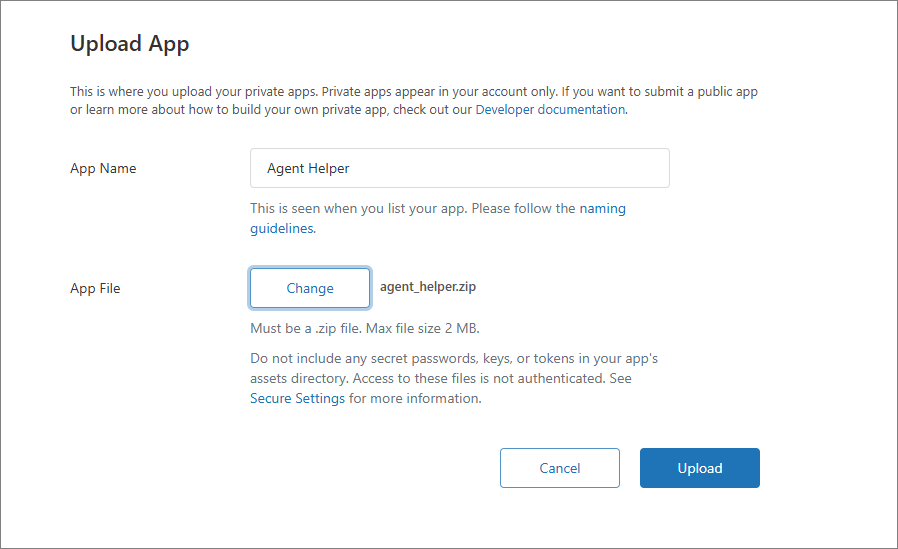 Give your app a Name and upload the .zipfile of the Agent Helper app you configured (refer to step 6 of the previous section).