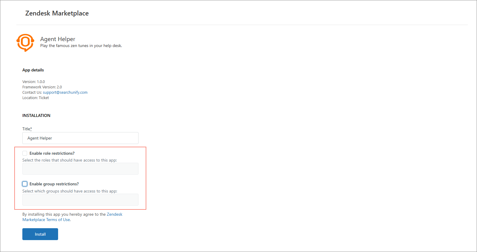 Once you have added the access restrictions, click Install to complete the installation of the Agent Helper application in Zendesk.