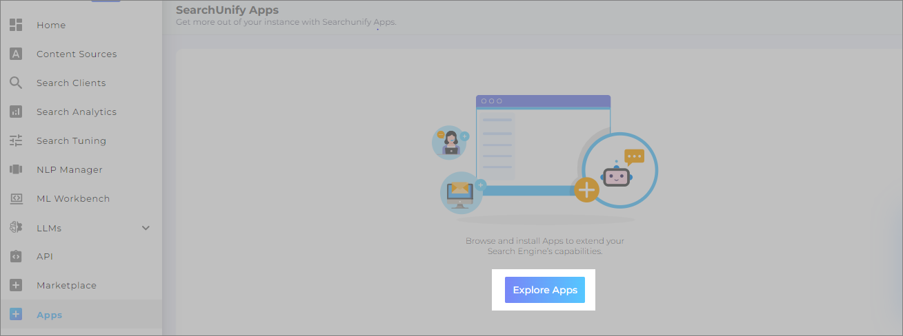 In the SearchUnify admin panel, navigate to Apps. If you have not yet installed any apps, click Explore Apps.