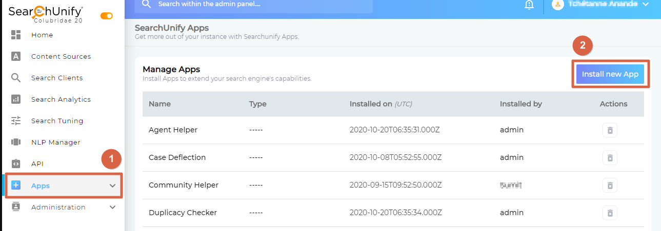 Currently, SearchUnify offers eight apps. To find these, click Apps and then Install new App, and go ahead with the installation process with a click of a button.