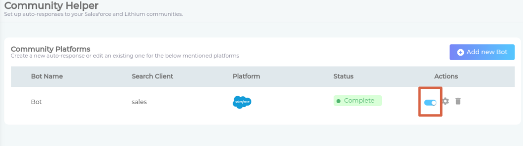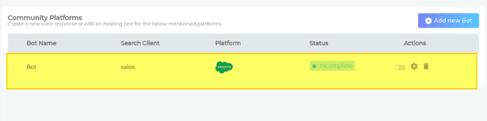 - An admin can create a new bot for each community. To start, click Add New Bot.