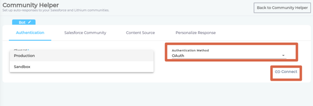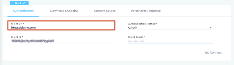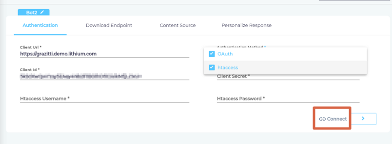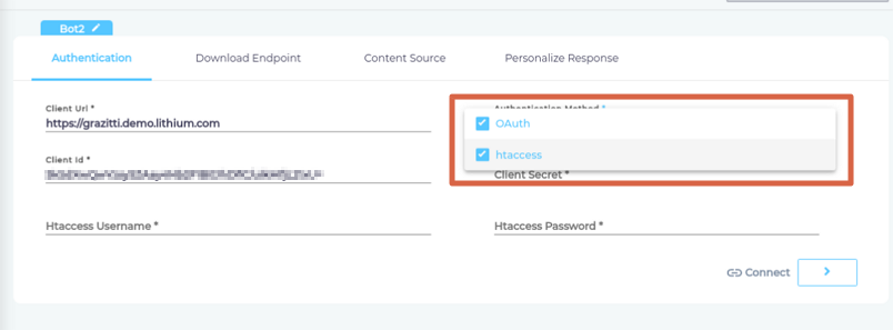 - Select either OAuth or HTAccess to authorize yourself. The first method requires a client ID and a client secret. The second method requires an SearchUnify admin to enter, besides a client ID and client secret, HTAccess username and HTAccess password.