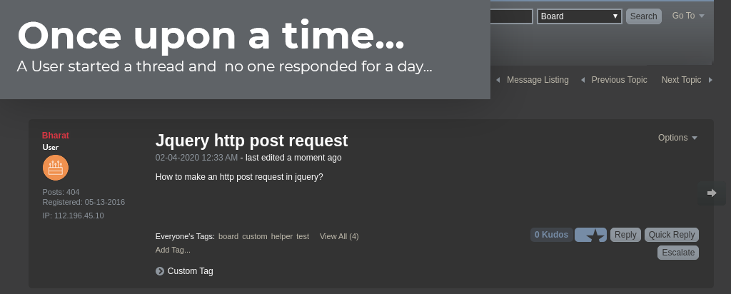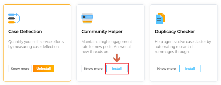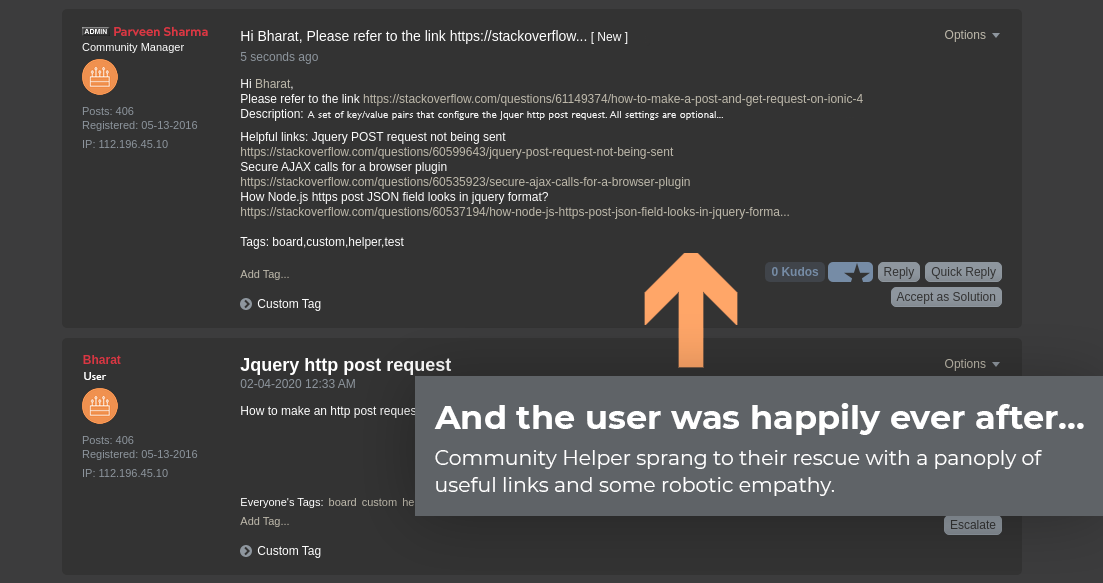 Community Helper is an entire team of support reps wrapped into a nifty bot. Once installed, it keeps looking for new threads that haven't been answered in time. Then, using its NLP analyzers, search capabilities, and built-in templates, it answers the original poster. An admin can set up the time Community Helper will wait before jumping in; from as 10 minutes to 3 days.