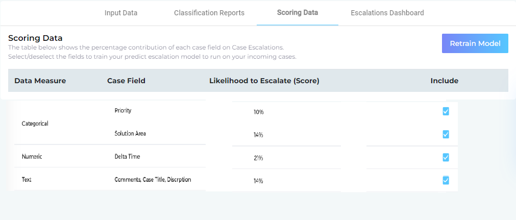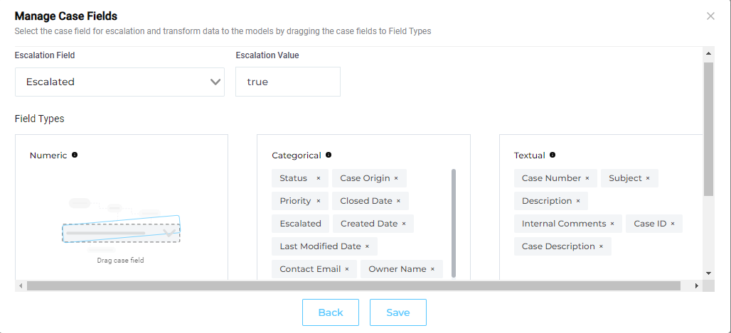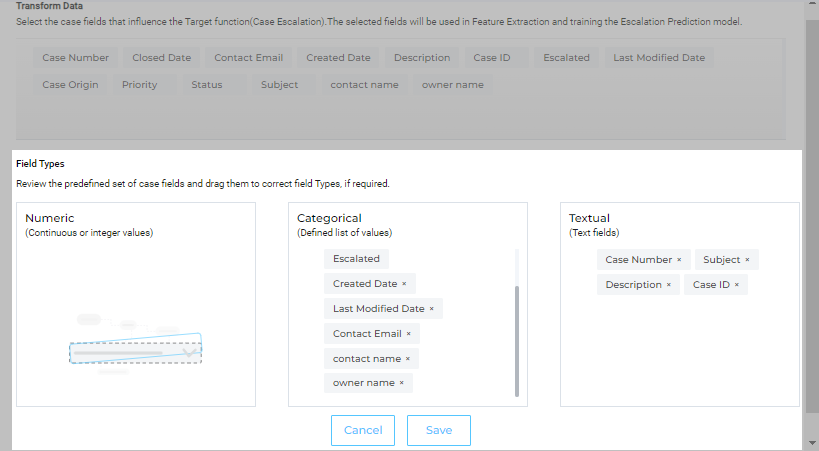 Escalation Predictor trains on cases to find those factors that lead to escalations. Depending on your case management system, the factors can easily run into dozens. The factors frequently include a case's title, a product's category, and the purchase amount. All of these factors (or case fields) are put into one of the three available categories in the app: Textual (used for sentiment analysis), Categorical, and Numerical.