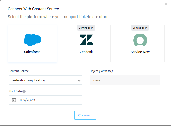 - To establish a correlation between cases and escalations, select your Salesforce content source where cases are logged. The Object field will be auto-populated. SearchUnify uses the