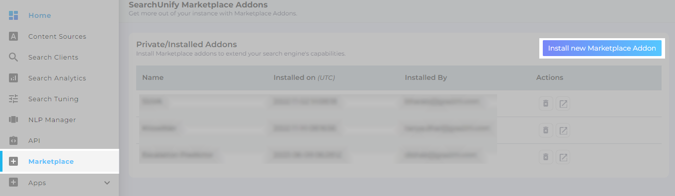 - From SearchUnify admin panel, navigate to Marketplace and click Install New Marketplace Addon.