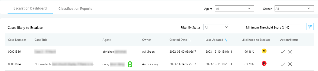 Agent Filter allows you to pull up cases by agent. Select an agent’s name to find all the cases the agent has worked on. The pulled up cases are segmented into two parts: Escalated Cases and Cases Likely to be Escalated.
