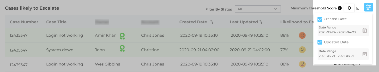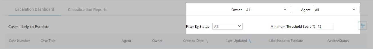 Owner Filter allows you to pull up cases by owner. Select an owner’s name to find all the cases the owner has created. The pulled up cases are segmented into two parts: Escalated Cases and Cases Likely to be Escalated.