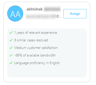 is shown. Clicking on it opens a pop-up with agent recommendations best suited to handle a case. Along with the agent name and email address, other details that show up in recommendations, including:-