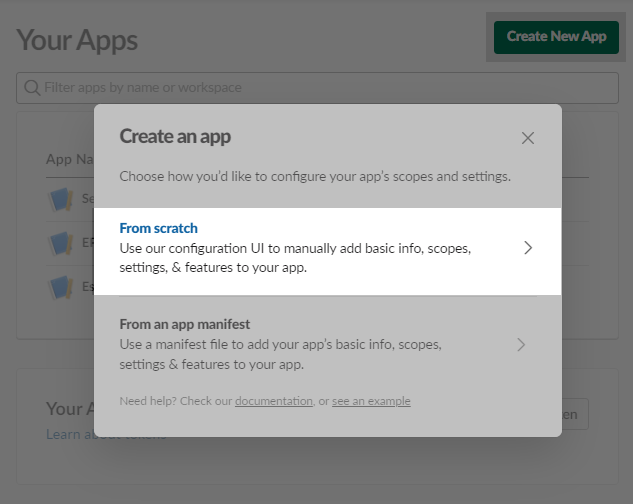 Enter a name for the app in the App Name field and select a Slack workspace from the dropdown Pick a workspace to develop your app in. Then click Create App.