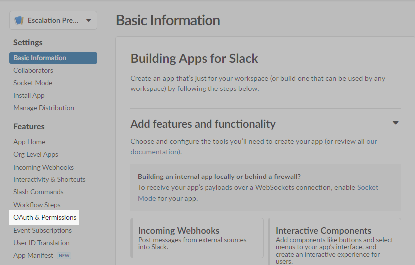 You will land on the Basic Information section of the app detail page. Navigate to OAuth & Permissions.