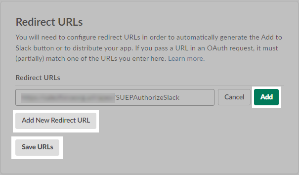 Scroll down to the Redirect URLs section. Click Add New Redirect URL and enter your Salesforce org URL in this format {{SalesforceOrg Base Url}}/apex/SUEPAuthorizeSlack. Click Done and Save URLs respectively.