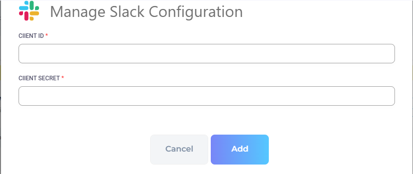 Enter the Client ID and Client Secret copied from the Slack App (refer to step 9 in the above section) and click Add.