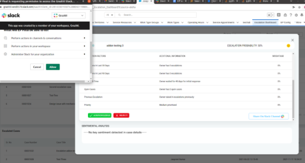 Open a case from the Cases Likely to Escalate list from the Escalation Dashboard. Click Share on Slack Channel. If redirected to a pop-up tab, allow your app to access Slack org and log into Salesforce if prompted.