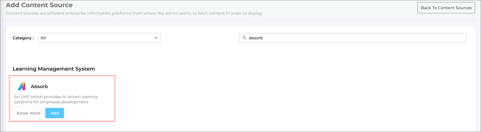 Locate Absorb LMS in the list of Content Sources and click Add.