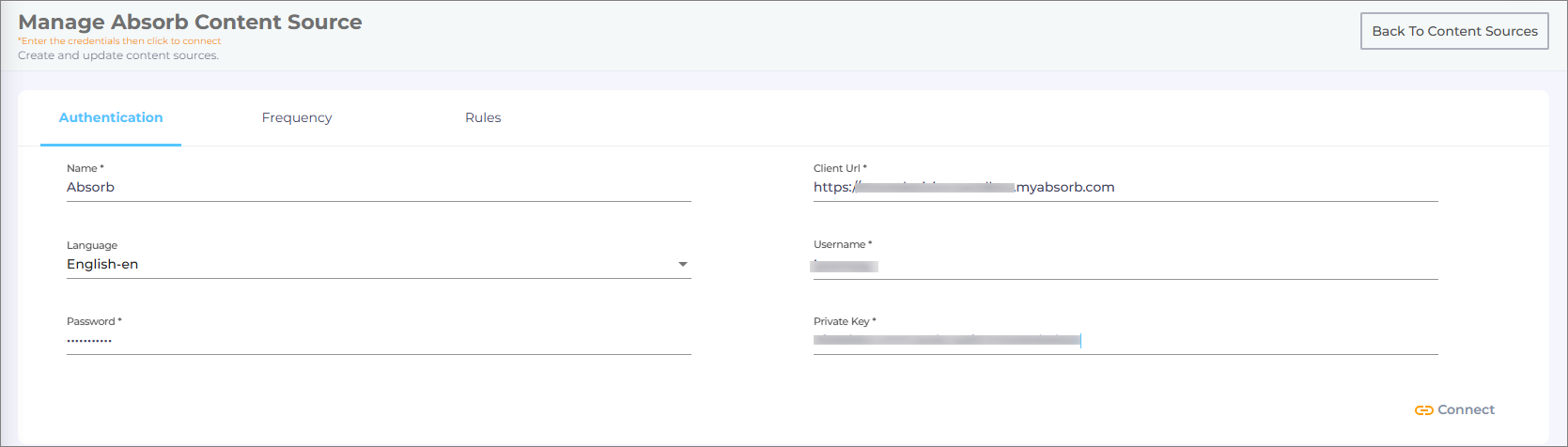 Ensure you have the Absorb LMS instance credentials, preferably with admin access. The courses will be crawled based on the access level of the account used for authentication. You must have your username, password, and private key available for authentication.