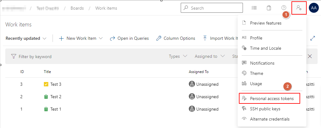 - After logging into your Azure DevOps account, click User Settings and select Personal access tokens.