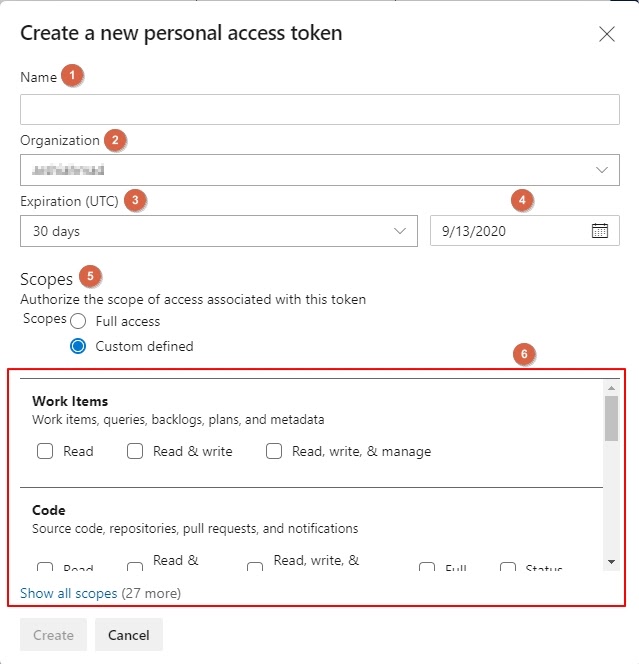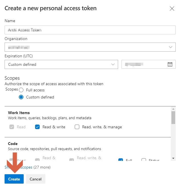- Scopes. Choose Full Access (recommended) or Custom Defined and then give read access to Work Items and Projects and Teams.