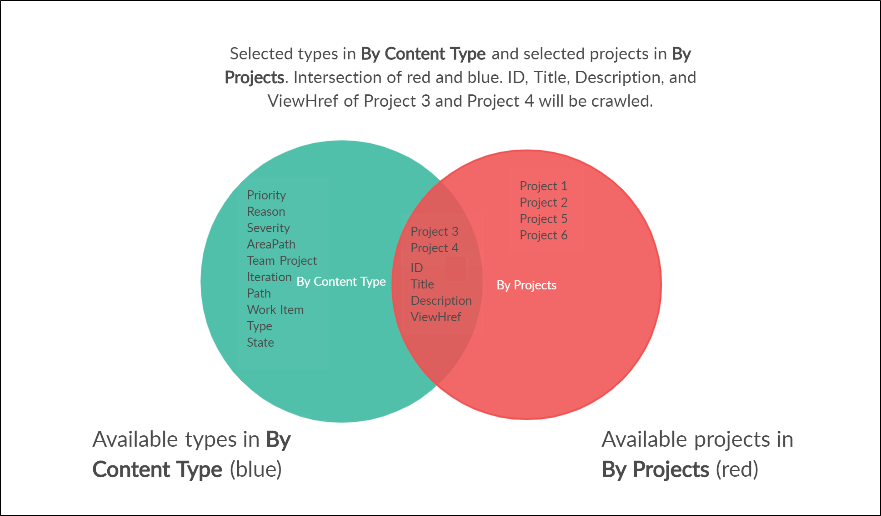Each Work Item has properties, such as an ID or the Team Project it is linked with. These properties are together called meta data and stored in the content type, azuredevops. Admins can specify which properties (content fields) are to be crawled and indexed on the screen By Content Type. The second screen, By Rules, enables Admins to select the projects whose Work Items are crawled. The next diagram summarizes.