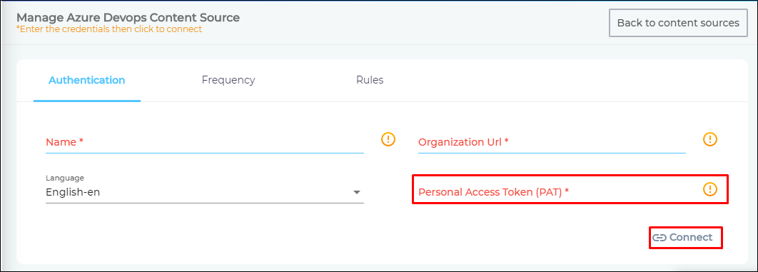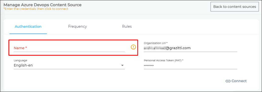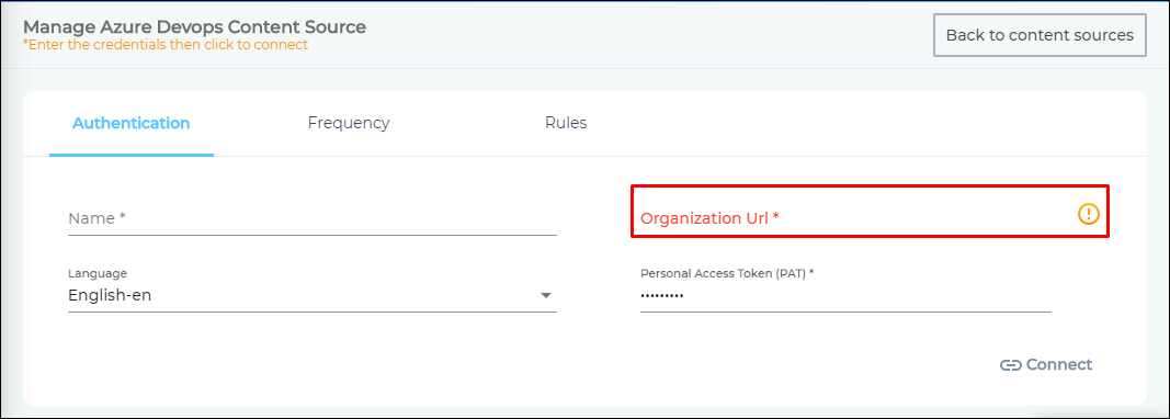 https://dev.azure.com/test123 - Enter your Personal Access Token (PAT) and click Connect. NOTE. Personal Access Tokens are temporary. Their maximum lifespan is one year. Then they have to be regenerated and content source has to be authenticated (or connected) again.