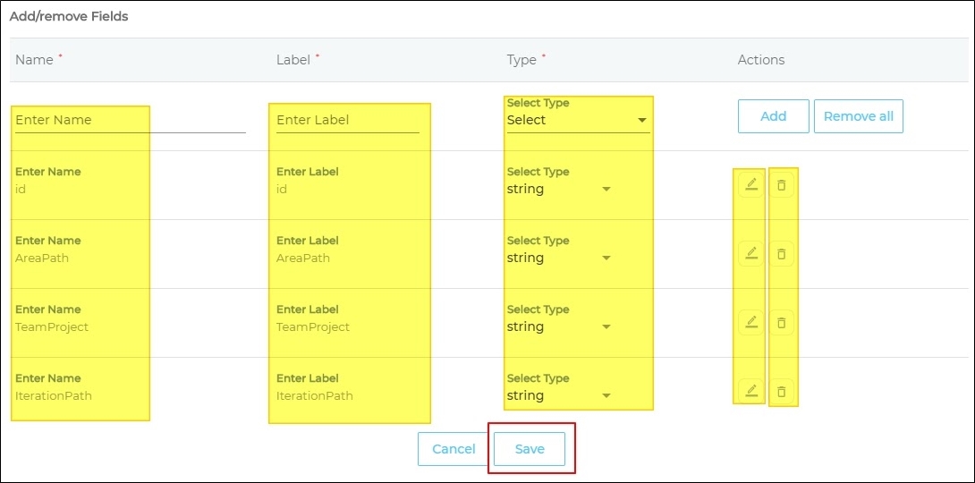 to remove a content field. The removed content fields are not indexed. To find a field that is not listed, use the Name column. To find standard fields, look up the field name and for custom fields append the field name with custom. Here's an example: custom.<filename>. Labels and Types are assigned to each field, but admins can choose to change the default labels and types. To edit existing content fields, click