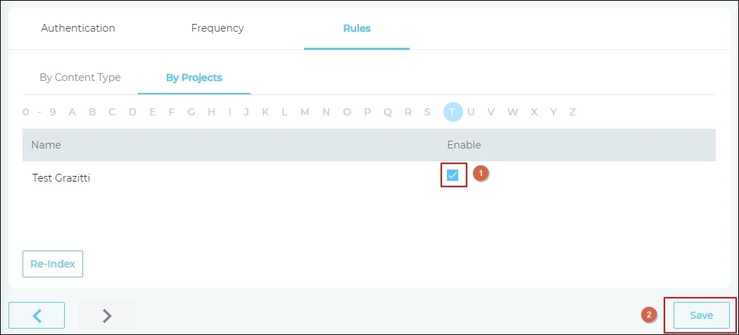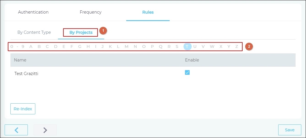 - Use the checkboxes in the Enable column to set projects for indexing. Once you have checked all the projects, click Save.NOTE. All the Work Items will be crawled if no project is selected.