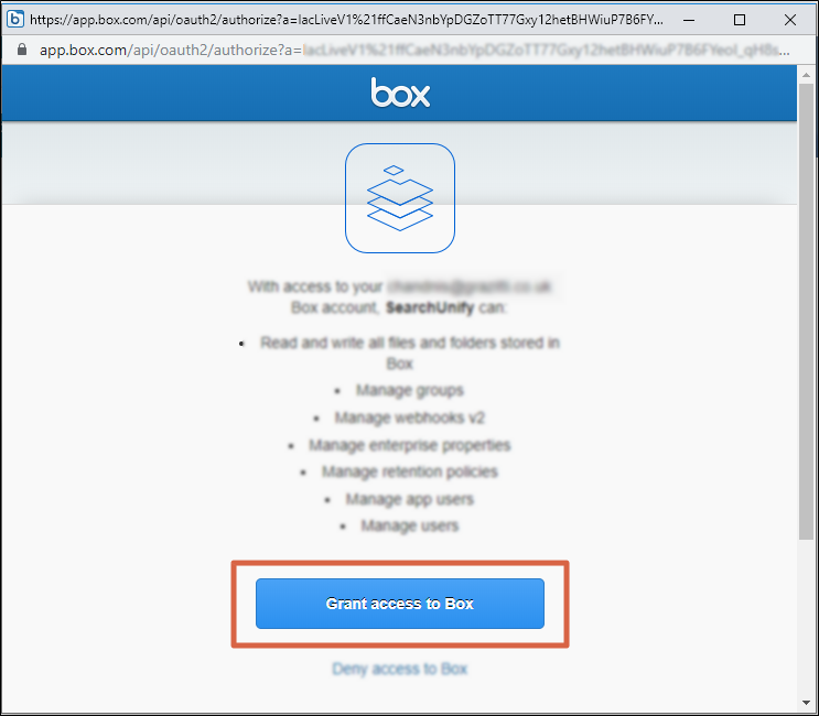 - In the window that has popped up, enter your Box login details (if you are prompted to) and click Grant access to Box.