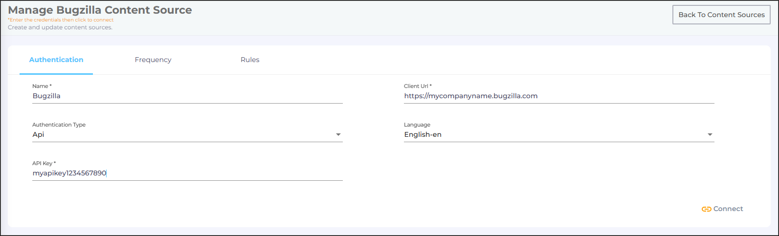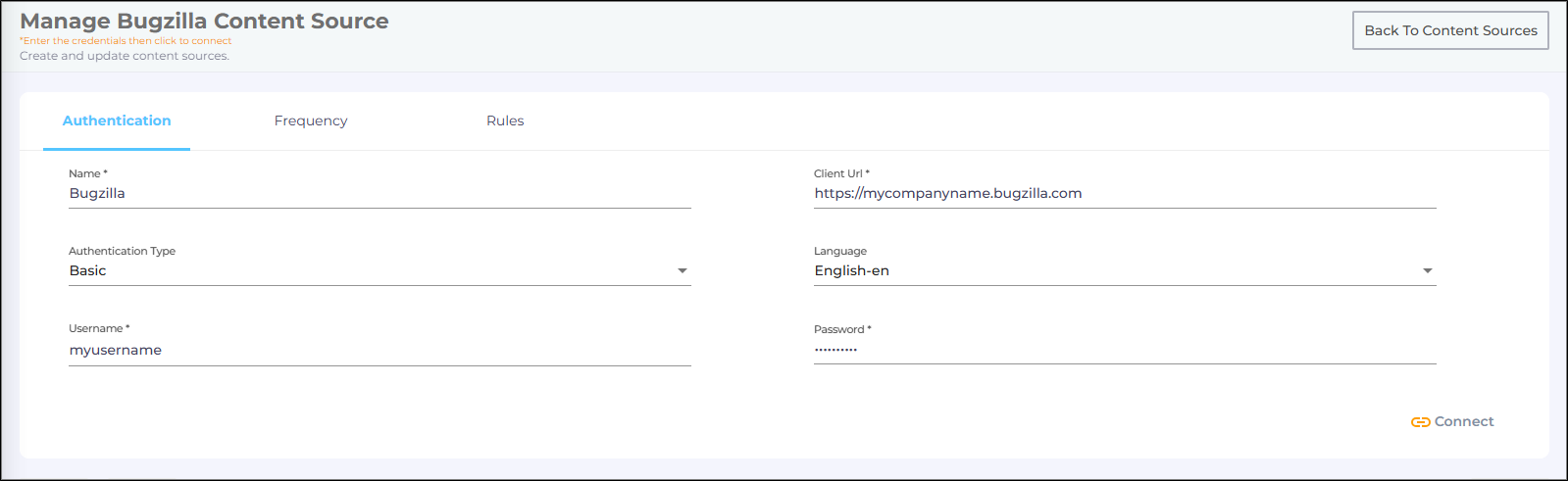 In both cases, the Content Source connection must be authenticated again. To reauthenticate a Content Source, enter the authentication details, and click Re-Connect.
