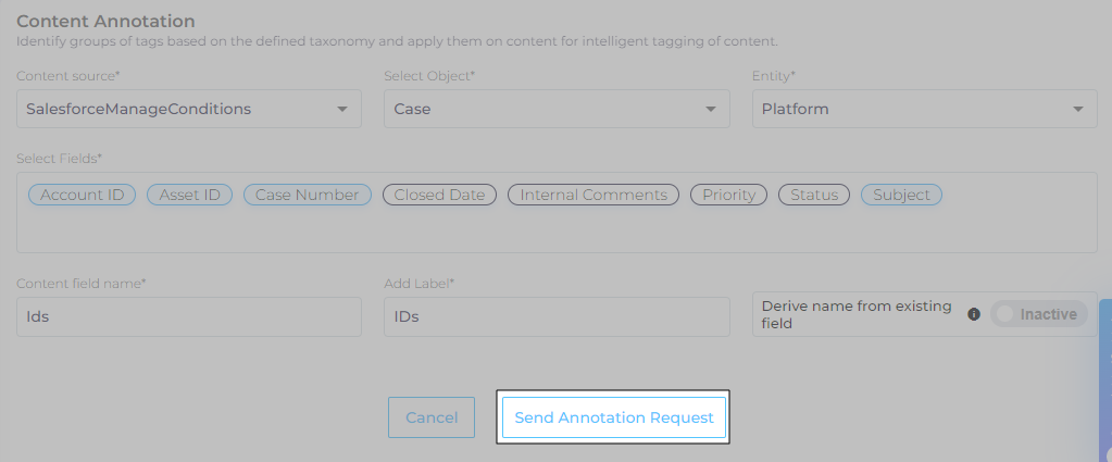 Click Send Annotation Request. Based on data size, annotation can take anywhere between a few minutes to several hours.