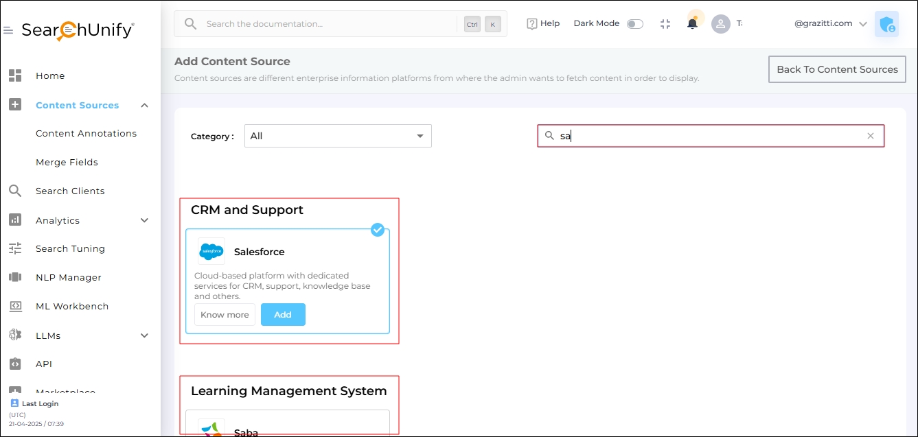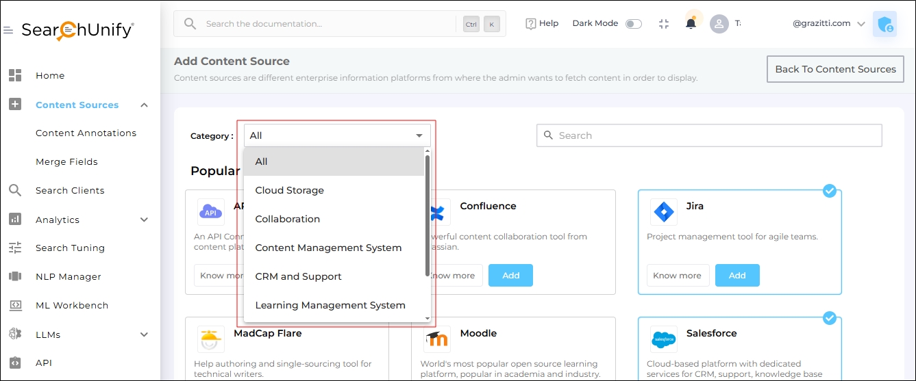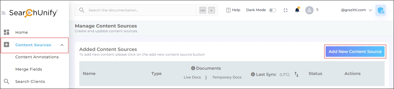 To view all the SearchUnify-compatible content sources, navigate to Content Sources and click Add new content source.