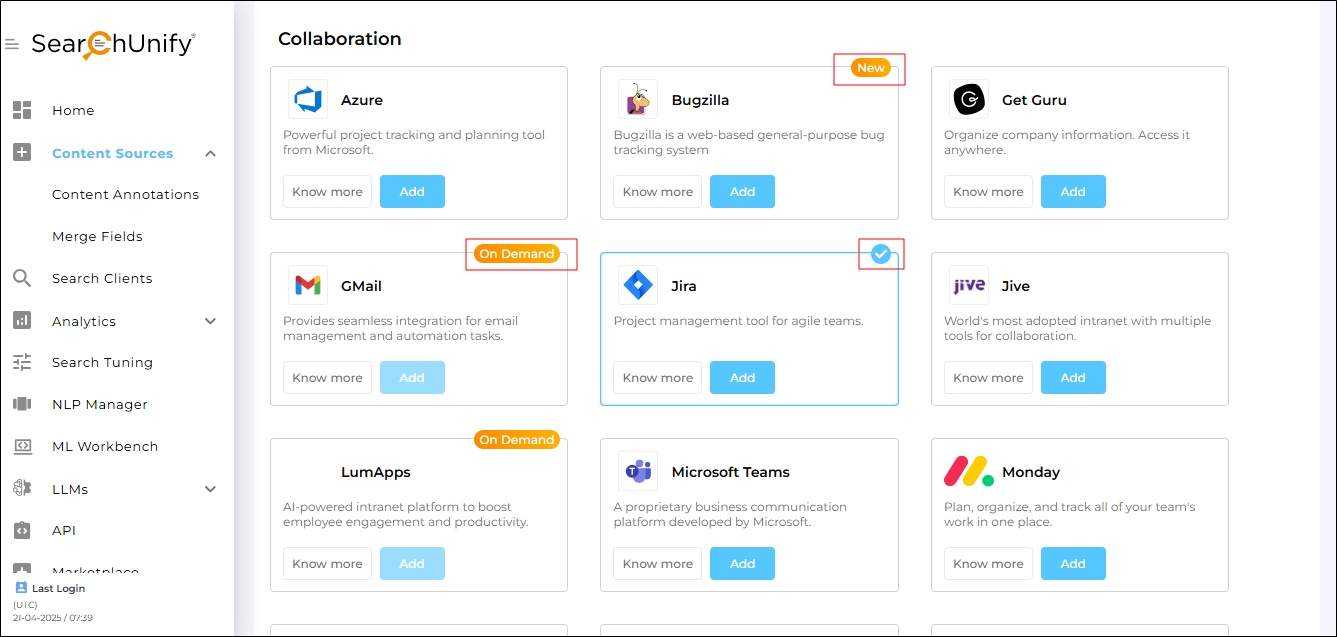 ) - It means that the content source can be added to your instance if you write to the SearchUnify support team. In the next image, Gmail is an On Demand content source.