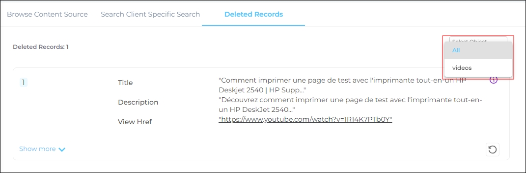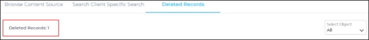 All the records removed from the index in the Browse Content Source are stored in Deleted Records. The total number of records in this tab is captured in the Deleted Records metric.