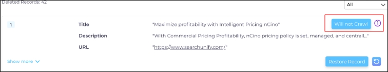 While removing records in Browse Content Source, the admins can choose not to crawl deleted records. When an admin checks Don't Crawl in Future in Browse Content Source, an info icon appears on the deleted record. When you hover over it, a message Will Not Crawl is displayed.
