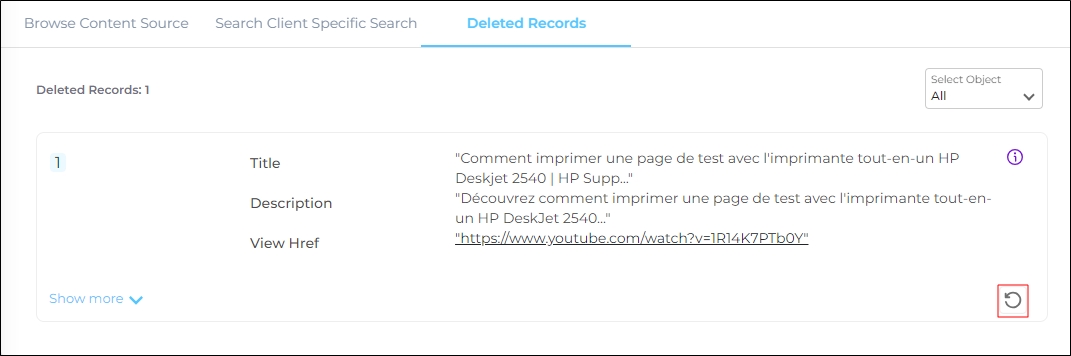 The admins can restore the deleted records back into the index with the Restore button. The restored records can be searched again.