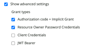 - Click Show Advanced Settings, and check Authorization code + Implicit Grant and Resource Owner Password Credentials.