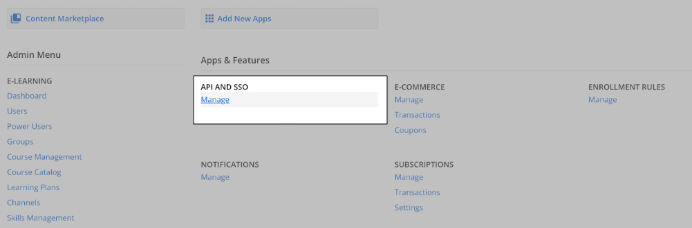 In Apps & Features, select API and SSO. NOTE. An alternative path to find API and SSO is to Add New apps > Third-Party Integration > API and SSO.
