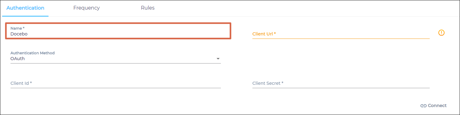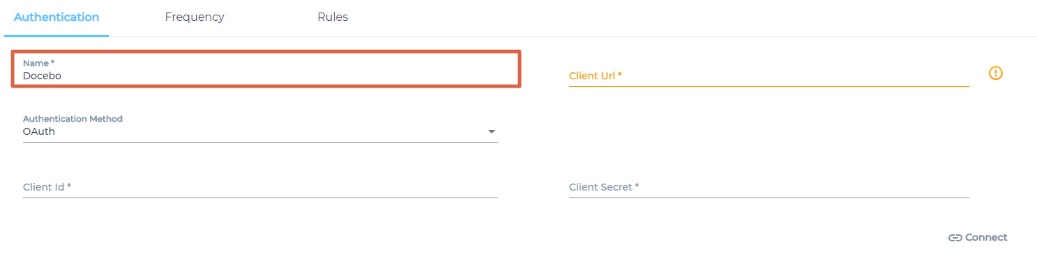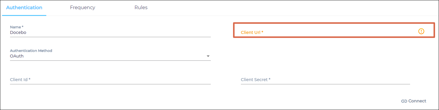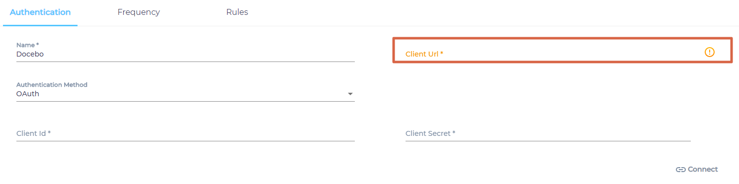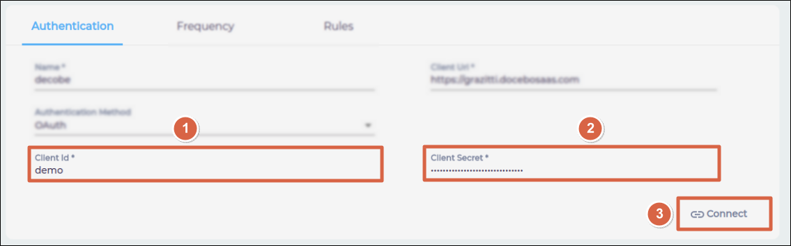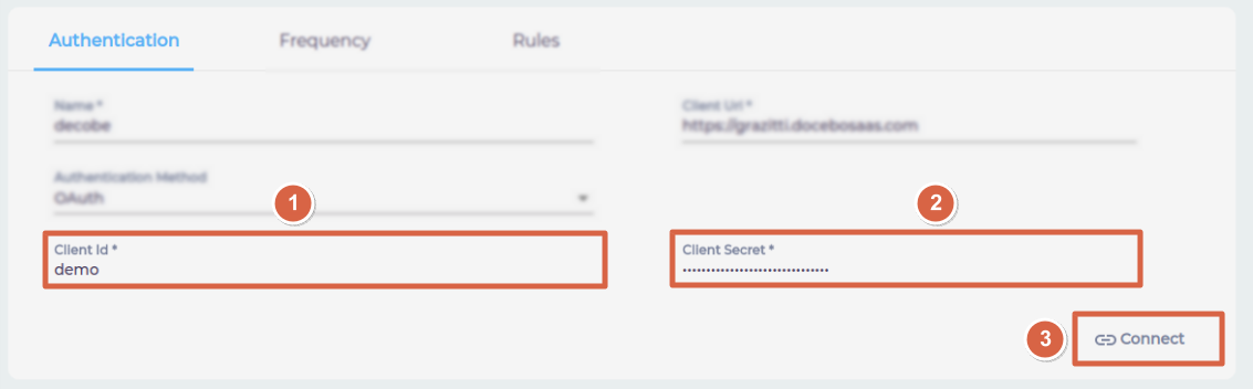 - Select an authentication method: Basic or OAuth. Enter Client ID and Client Secret upon selecting OAuth. The authentication method Basic requires two more fields: Username and Password. The username is the ID used to log into Docebo and password is the profile password used to log in.