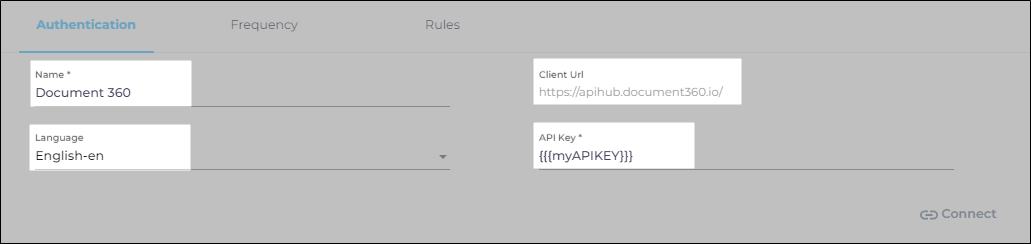 API Key. Enter the API token key. To obtain it, refer to How to Set up API token in Document360. NOTE. While generating the API token, select GET as Allowed Method(s) for successful authentications. Alternatively, you can select all four: GET, POST, PUT, and DELETE.