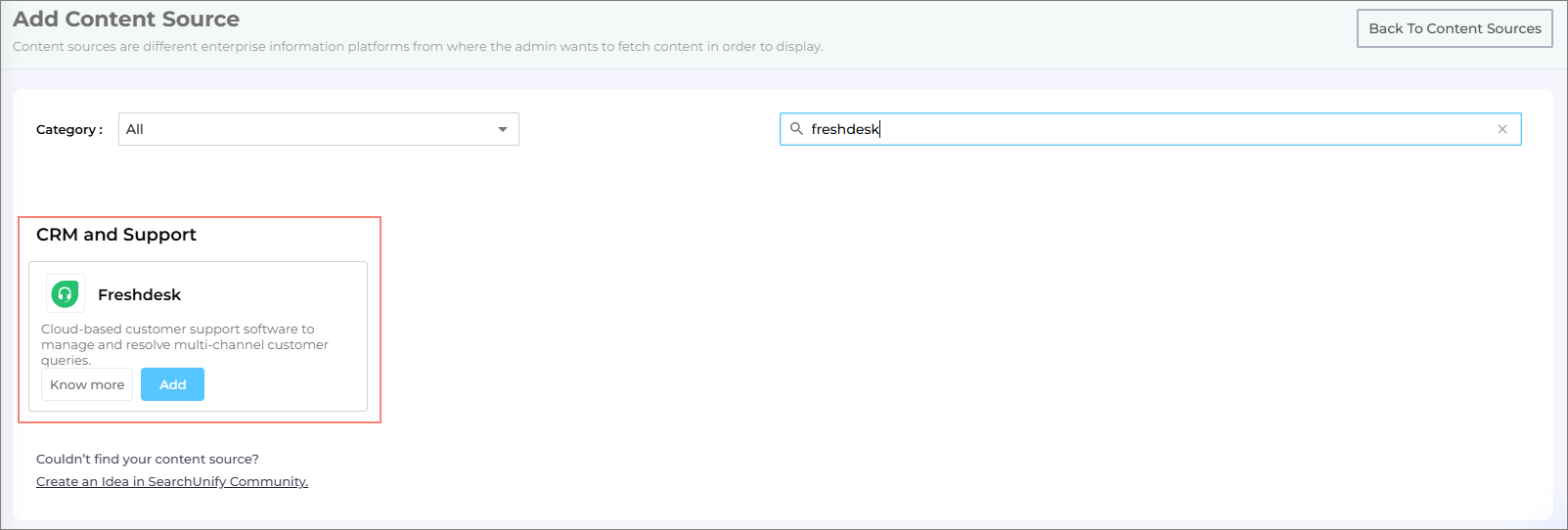 To make your Freshdesk tickets searchable in the SearchUnify-powered search, you need to add Freshdesk as a Content Source in SearchUnify.