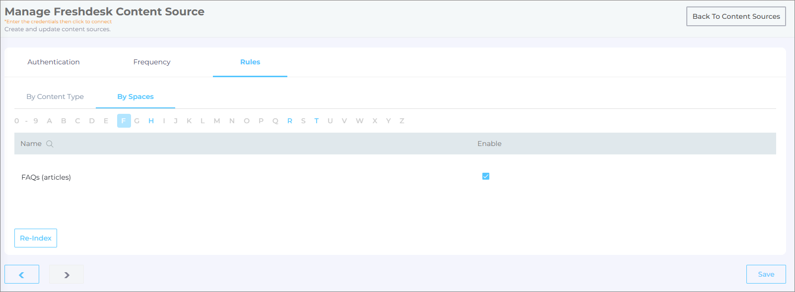 Under the By Spaces subtab, use the alphabetical index to locate spaces. Letters highlighted in blue indicate available products. For example, FAQs (articles) is under the letter F as shown in the image below.