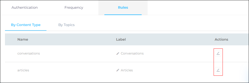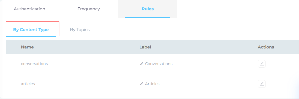 You can see the conversations and articles are already configured. Click on the edit button from the Actions column to view or edit the fields for content types. Although, it is not recommended for users to edit or delete any field that is already added.