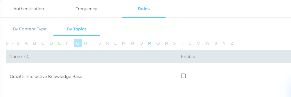 Switch to By Topics. Use the alphabetical index to find topics. For example, Grazitti Interactive Knowledge Base is under the alphabet G.