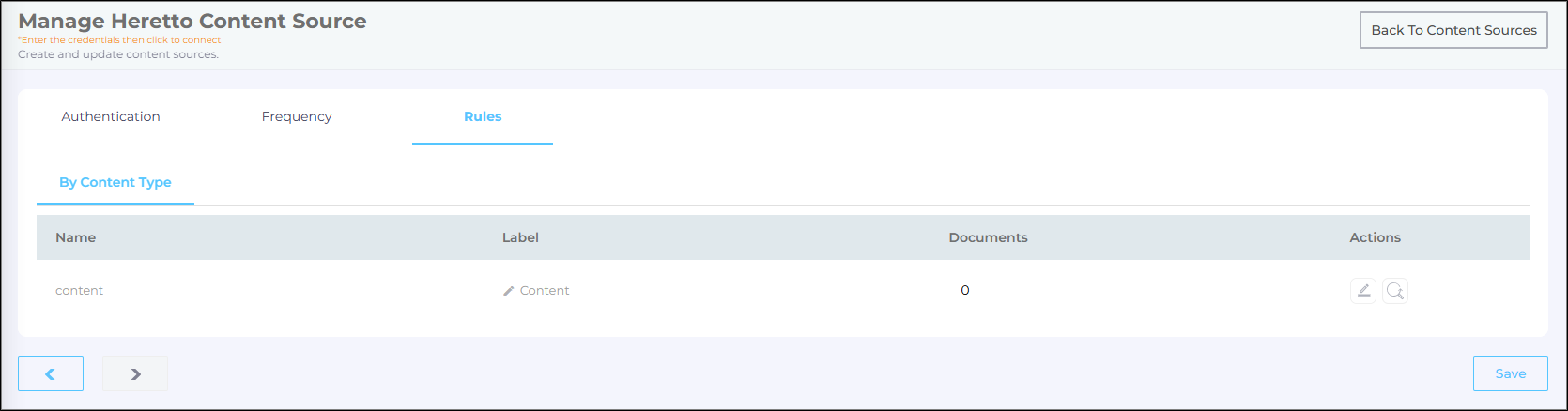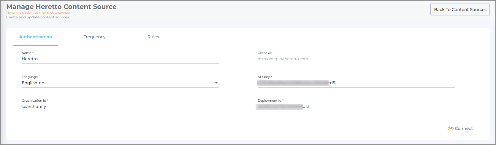 In both cases, the Content Source connection must be authenticated again. To reauthenticate a Content Source, enter the authentication details, and click Re-Connect.