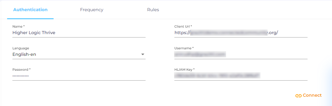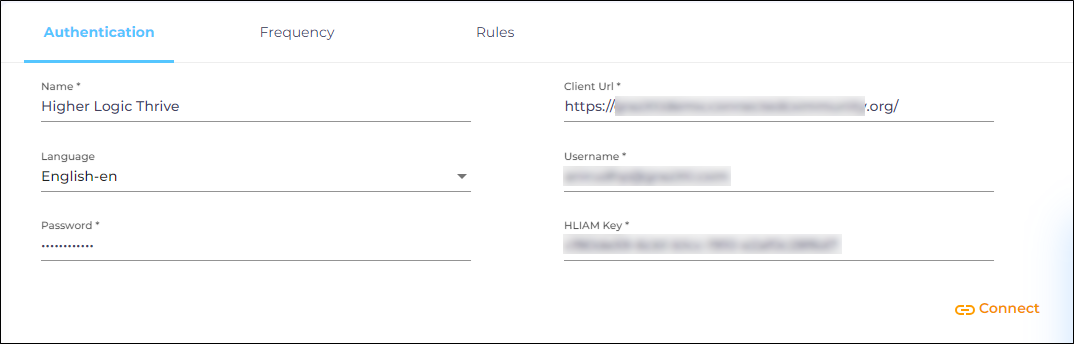Client URL. Enter the URL of your Higher Logic Thrive community instance..