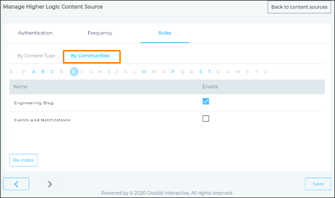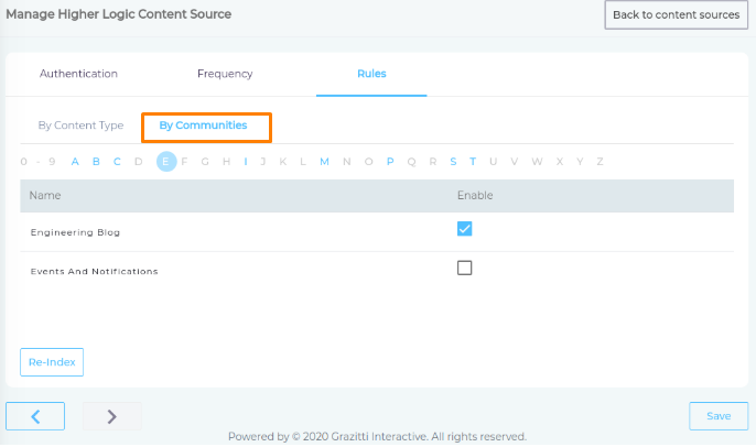 Switch to By Communities subtab, and you will see all the communities and you can check the communities, whose data should be indexed.